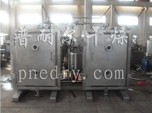 真空干燥机为较古老的干燥装置,箱内被加热板分成若干层。加热板中通入热水或低压蒸汽作为加热介质,将铺有待干燥药品的料盘放在加热板上,关闭箱门,箱内用真空泵抽成真空。加热板在加热介质的循环流动中将药品加热到指定温度,水分即开始蒸发并随抽真空逐渐抽走。此设备易于控制,可冷凝回收被蒸发的溶媒,干燥过程中药品不易被污染,可以用在药品干燥、包材灭菌及热处理上。