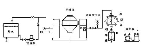 双锥回转真空干燥机为双锥形的带有夹套的回转罐体,工作时罐内处在真空状态下,夹套内通入蒸汽或热水,热量通过罐体内壁与湿物料接触,湿物料吸热后蒸发出水汽,通过真空泵经真空排气管抽走。由于罐体内处于真空状态,且罐体的回转使物料不断的上下内外翻动,加热面不断更新,加快了物料的干燥速度,提高干燥效率,达到均匀干燥的目的。双锥回转真空干燥机系统主要由双锥回转真空干燥机、冷凝器、除尘器、真空抽气系统、加热系统、冷却系统、电控系统等组成。