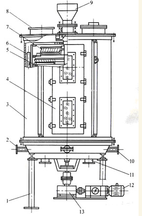 1-支架;2-进汽管;3-机体;4-检修门;5-盘支架;6-分气管;7-搅拌耙;8-排气口;9-给料口;10-冷凝水排口;11-排料;12-电机;13-减速机