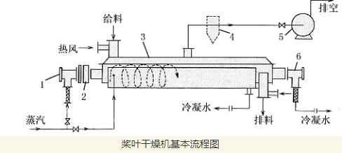 像所有传导干燥设备一样,桨叶干燥机也是利用加热面对物料传热,不同的是,桨叶干燥机既有静止的加热面,即夹套,也有移动的加热面,即中空主轴和其上焊有的若干中空楔形桨叶。加热面内通入加热介质,通过器壁将热量传给物料,使物料升温,水分蒸发。楔形桨叶在随同主轴旋转时,不断对物料挤压、剪切、搅拌、分散,强化了传热传质速率,改变主轴转数,即可改变搅拌强度。同时,桨叶特殊的几何形状,使桨叶本身具有自洁功能,加热面不断被更新。工作时,物料由加料口给入后,在搅拌桨叶和夹套共同作用下,水分蒸发,湿度下降,流动性增强。由于机器安装有1~5°倾角,在搅拌器不断翻动过程中,已干燥的物料会依自然安息角方式向低端移动,^后经溢流堰板排出机外,调整溢流堰高度,可控制物料滞留时间。湿气体通过除尘设备分离出粉尘后,经排风机引出。如工艺需要,可引入一定量热空气补充到干燥室内,作为湿气体的携带气体,防止物料中蒸发的湿气在干燥室内和后续处理设备中结露。一路蒸汽通过回转接头给入主轴和桨叶,冷凝水同样通过回转接头排出,另一路蒸汽则直接给入夹套,放热后排出冷凝水。桨叶干燥机典型工艺流程如下: