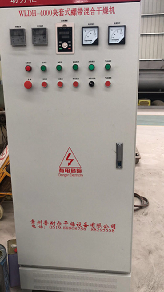该螺带混合干燥机型由容器夹套式组成,夹套可热水蒸汽循环,达到干燥混合制作。该设备顶端设有雾化装置组成,物料三把二流体喷枪每分钟雾化12公斤工业油,外保温、螺旋搅拌叶片和传动部件 组成:螺旋叶片一般做成双层或二层,外层螺旋将物料从两侧向中央汇集,内层螺旋将物料从中央两侧输送,形成对流混合干燥。