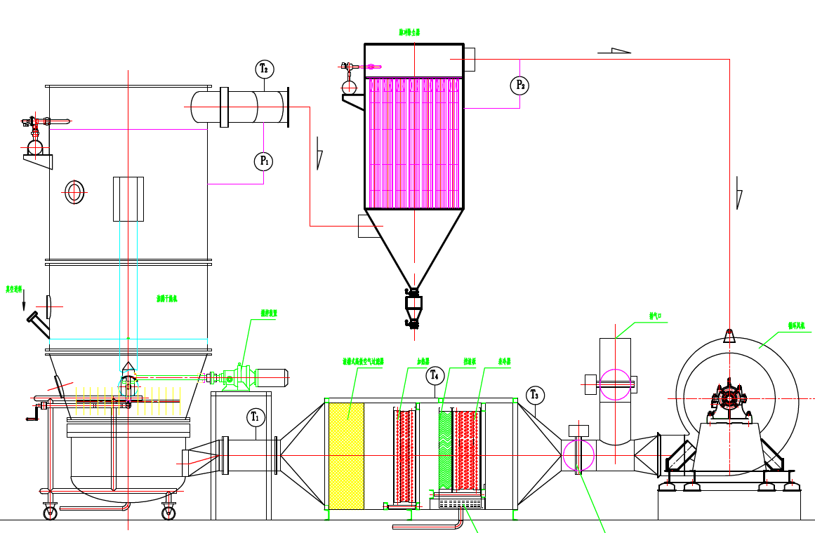 二、干燥:系统充氮后,设备内部的风经过风机驱动;进入过滤器过滤,加热器加热进入主机;在主机的料斗中经过大面积的气固接触,进行传质传热的双相交换(带走溶媒,留下热量);随后进入除尘器,细粉再次被截留;随后进入冷凝器,再次进行传质传热的双相交换(带走热量,留下溶媒),之后再回到风机,实现循环。干燥时设备内部与外部无任何。