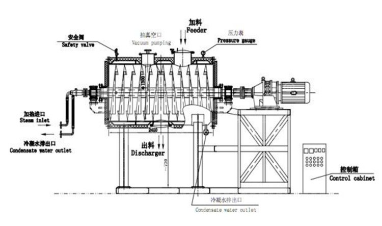 带有中空叶片的空心轴在给物料加热的同时又对物料进行搅拌,从而进行加热面的更新。是一种连续传导加热干燥机。真空耙式干燥机是一种新颖卧式间歇式真空干燥设备,湿物料经传导蒸发,