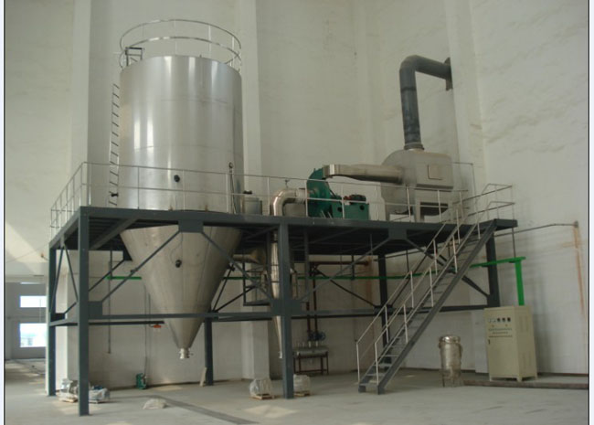 空气经过滤和加热,进入喷雾干燥机顶部空气分配器,热空气呈螺旋状均匀地进入干燥室。料液经塔体顶部的高速离心雾化器,(旋转)喷雾成极细微的雾状液珠,与热空气并流接触在极短的时间内可干燥为成品。成品连续地由干燥塔底部和旋风分离器中输出,废气由引风机排空。