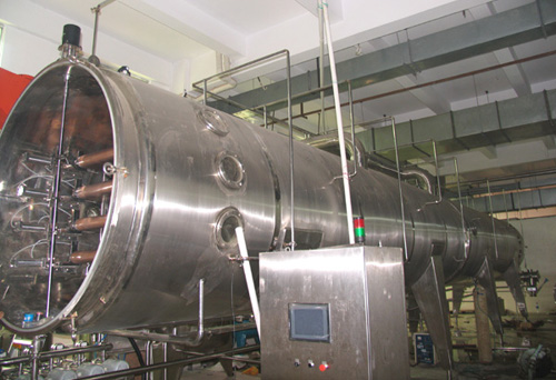 待干燥的物料通过螺杆计量泵将其送入干燥机的真空室内,并由布料电机均匀的滩涂在传送带上。由电机驱动特制的辊轴传动传送带,并以设定的速度运转。传送带下面设有相互独立的加热板和一组冷却板,传送带与加热板、冷却板紧密贴合,以接触传热的方式将干燥所需的热量传递给物料与冷却。根据物料性质的不同设定传送带的运转速度,当物料由传送带从筒体的一端运送到另一端时,物料已经干燥并冷却。传送带折回时,干燥后的料饼从传送带上剥离,通过粉碎装置进行粉碎后,经由蝶阀气闸出料,获得的颗粒,可直接制成胶囊或压片。