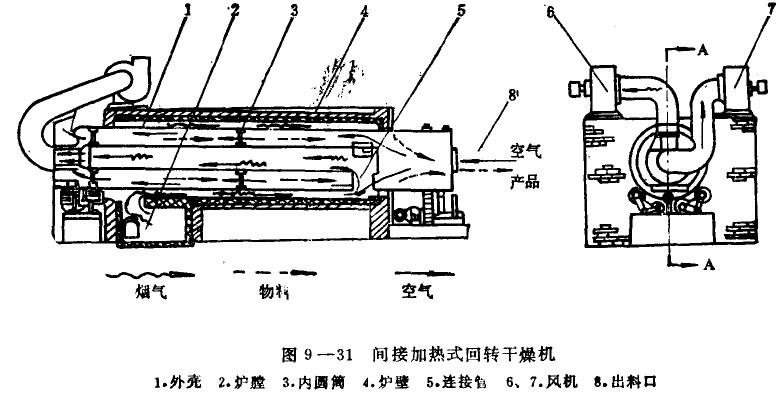 干燥器为略带倾斜的水平园筒,物料与热空气对流经过干燥器,是一种出现较早的机型。虽然结构比较简单,但热效率高,允许高温操作。现矿山或无机化工行业应用仍较多。若干年来,对筒内扬料板(抄板)结构的改进,增设供热管和内套筒等,都使这种干燥器的性能不断提高,应用范围仍有扩大。