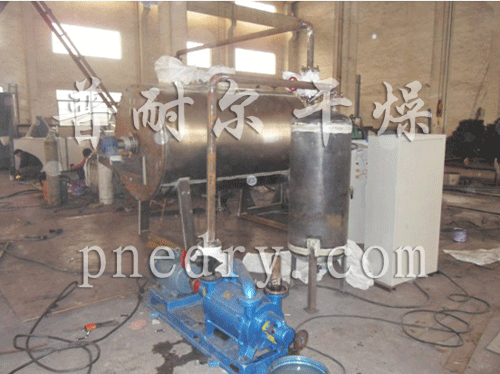 被干燥物料从顶部加料口加入,在密闭盖口后,往壳体夹套内通人蒸汽或热水,开动真泵。在连续正反转动的耙齿的搅拌下,物料与壳体壁接触时,表面不断更新,物料受到蒸汽或热水的间接加热,而使物料水分被汽化。真空泵产生的高真空,一般在53.28-93.24Pa,抽走汽化的水分,更加剧物料表面水分、内部水分的蒸发,从而达到干燥目的。物料内水分汽化并经干式除尘机、湿式除尘机、冷凝器,由真空泵出口放空。