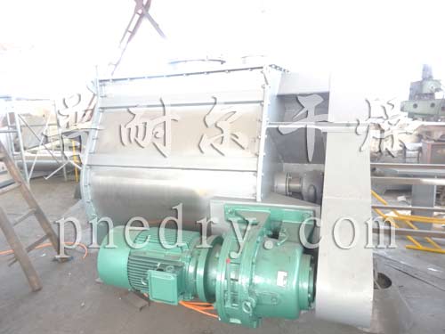 该机在w形的混合室内装有一对以相反方向旋转的轴,在每个轴上安装具有一定角度、一定数量且呈重叠状的桨叶,在具有一定圆周速度的混合室内形成流动层,层内的物料在对流混合原理的作用下进行混合,并在瞬间处于失重状态,因而得到均匀混合物。 在容器上方亦可装有喷液口,进行喷加液体的固-液混合