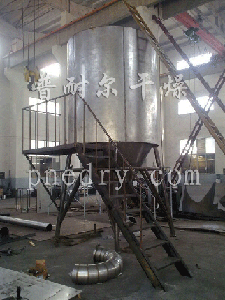 工作原理:本机组工作流程为料液通过隔膜泵大压输入,喷出雾状液滴,然后同热空气并流下降,高部分粉粒经塔底排料口收集,废气及其微低粉末由旋风分散器分散,废气经抽风机流出,粉末经设在旋风分散器下端的授粉筒收集,风机出口还可装备二级除尘装置,收回率在96-98%以上。