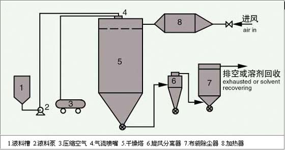 洁净空气加热后进入干燥塔,在塔内热用二流体(或三流体)喷嘴将各种料液雾化成微小液滴,与热风进行快速交换,蒸发掉液料中的水份(或溶剂),并随热风排出,得到粉状或颗粒状产品。 产品特点 1.尤其对粘性大、膏状、浆糊状物料。效果佳,其他设备无法替代。 2.实验型多品种,低温干燥应用广。 3.喷嘴结构简单,维修方便,运行费用低。