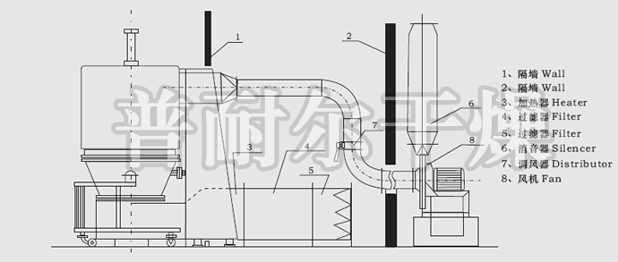 空气净化加热后,由引风机从下部导入,穿过料斗的网板,在工作室内,经搅拌和负压作用形成流态化,不断进行大面积的气固两相对流干燥,水份蒸发后随排气带走,达到物料干燥的目的。 安装示意图: