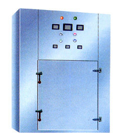 将装满物料的烘盘、瓶子或小车放入箱内,启动PLC可编程序控制系统,内循环风机工作、加热、蝶阀同时开启、干燥箱迅速升温。在内循环风机作用下,干热空气通过耐高温高效过滤器进入箱体,在微调节板作用下形成一个均匀分布空气向箱体内传递,干燥空气吸收瓶子(物料、物品)表面的水份,进入加热通道蒸发排出、干空气在风机作用下定向循环流动,水蒸气排出。随着水蒸气逐渐减少、同时间隙性补充新鲜过滤空气,箱体内呈微正压状态,恒温结束,过程控制完毕。开启送风或(进水)强制冷却,自动蝶阀进入关闭状态,声光提示开门出瓶。