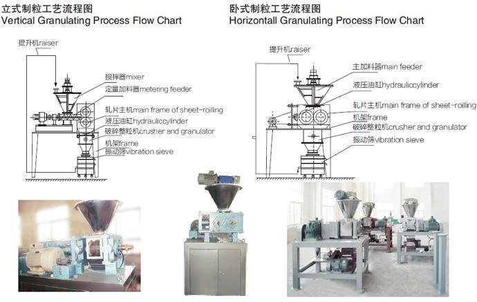 立式制粒工艺除了加料方式和轧辊安装方式与卧式制粒机组不同外,其工作原理完全相同。在立式制粒机组中,粉料由振动料 斗进入搅拌器被搅拌脱气后,由定量加料器的螺旋送至两个上下设置的轧辊的弧形槽内并被预压,以后工艺过程和卧式制粒机组相同。