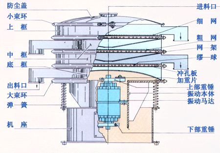 本机由料斗、振荡室、联轴器、电机组成。振荡室内有偏心轮、橡胶软件、主轴、轴承等组成。可调节的偏心重锤经马达驱动传达到主轴中心线,在不平衡状态下,产生离心力,使物料强度改变在筛内形成轨道旋涡。重锤调节器的振幅大小可根据不同物料和筛网进行调节。