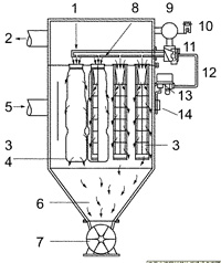 1.压缩气口 2.清洁气体出口 3.滤网架 4.滤网袋 5.空气进口 6.粉尘收集箱 7.旋转下料阀 8.文氏管 9.供气口 10.压力开关 11.膜片阀 12.(辅助)气控管 13.电磁阀 14.顺序控制器 |